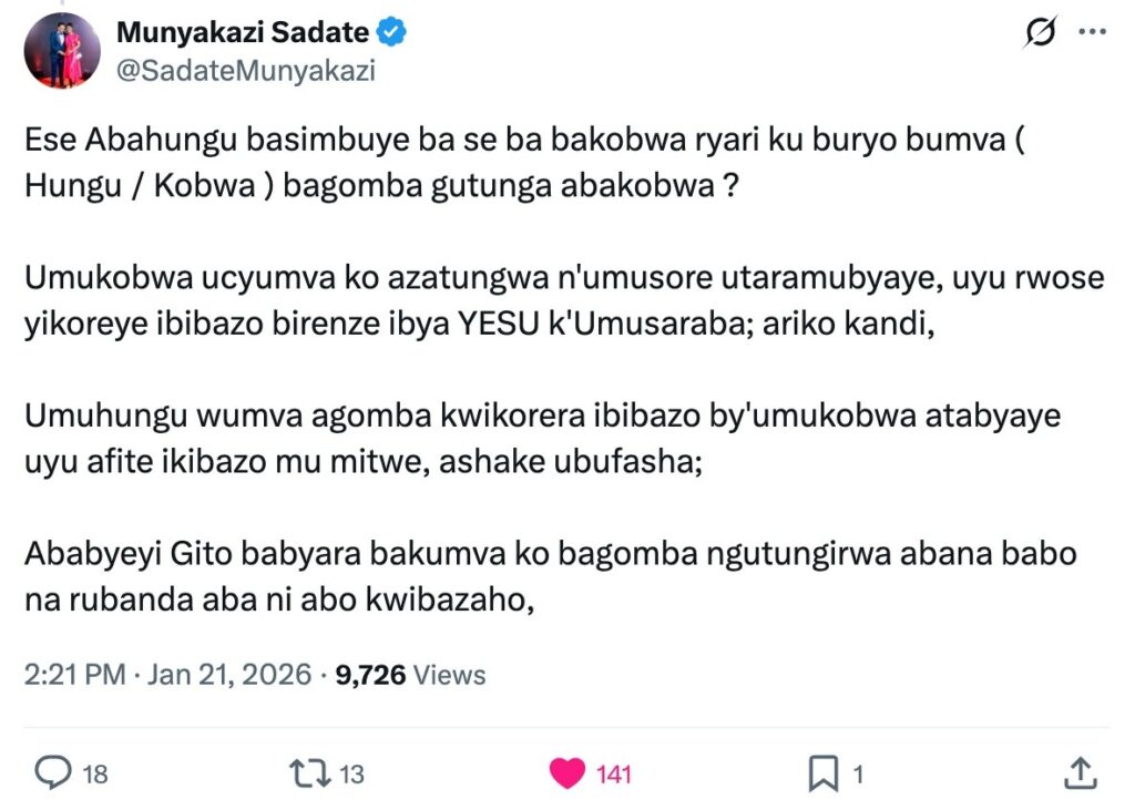 Ati “Ese abahungu basimbuye ba se ba abakobwa ryari ku buryo bumva bagomba gutunga abakobwa? Umukobwa ucyumva ko azatungwa n’umusore utaramubyaye, uyu rwose yikoreye ibibazo birenze ibya Yesu k’umusaraba, ariko kandi, umuhungu wumva agomba kwikorera ibibazo by’umukobwa atabyaye uyu afite ikibazo mu mitwe, ashake ubufasha.”