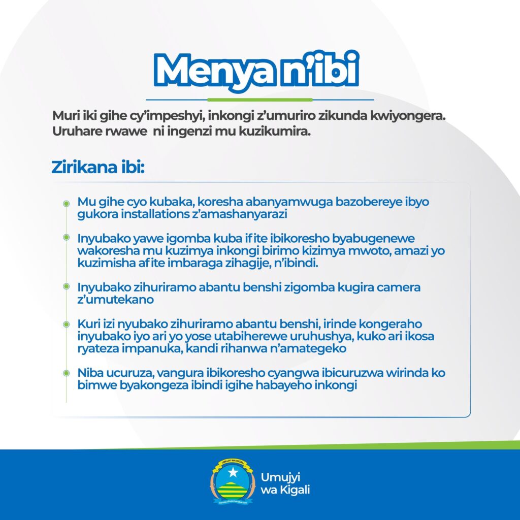 Umujyi wa Kigali uributsa ko inyubako zigomba kuba zifite ibikoresho bikumira inkongi birimo kizimyamwoto, amazi afite umuvuduko ukwiye yo kuzimisha n’ibindi bikoresho bishobora kugoboka mu gihe cy’iyo sanganya.