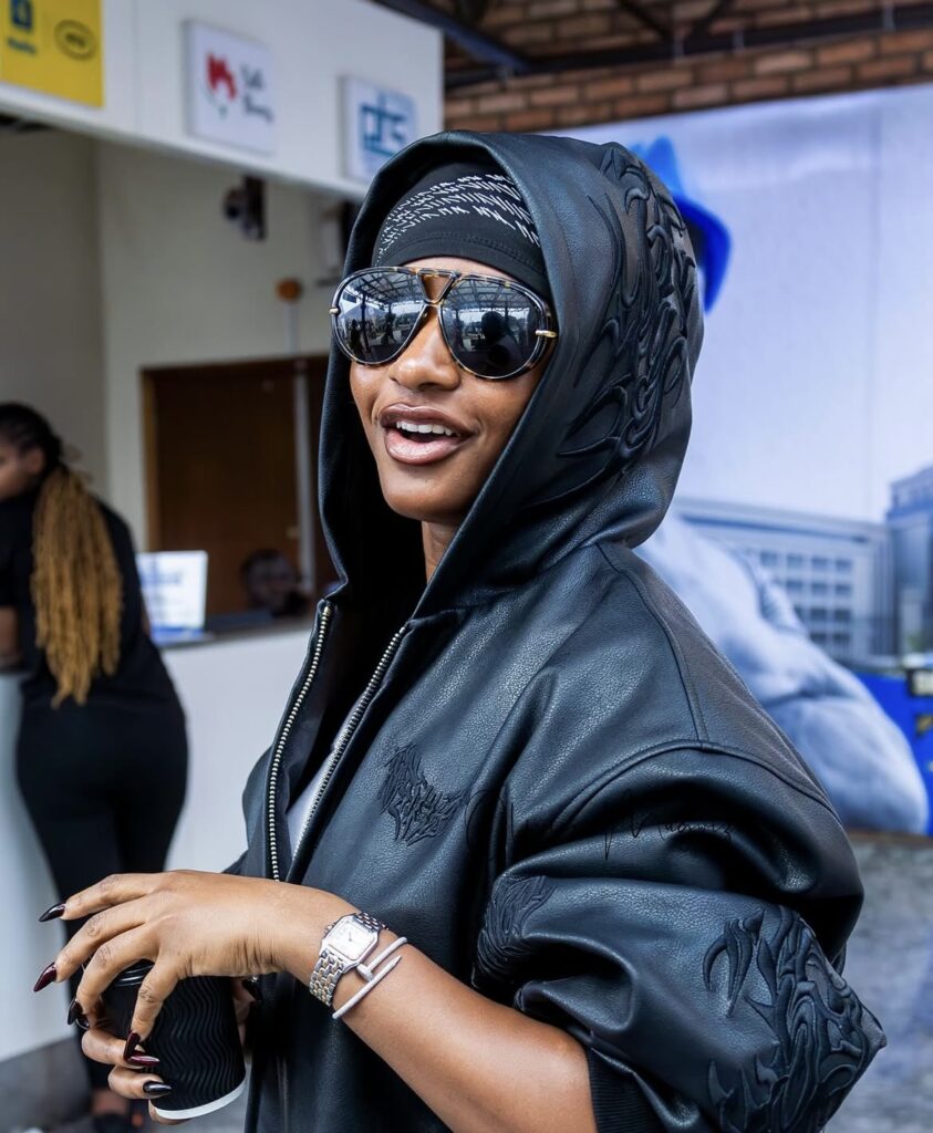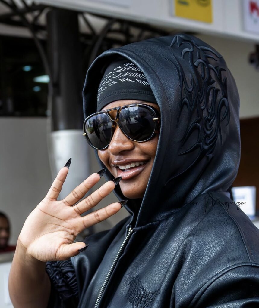 Ayra Starr yageze mu Rwanda ku kibuga cy’Indege cya Kigali giherereye i Kanombe, mu gitondo cyo kuri uyu wa gatandatu, yari yambaye ipantaro n’umupira w’umukara ufite ingofero, imbere yayo yambariye indi ngofero n’amarinete y’umukara.