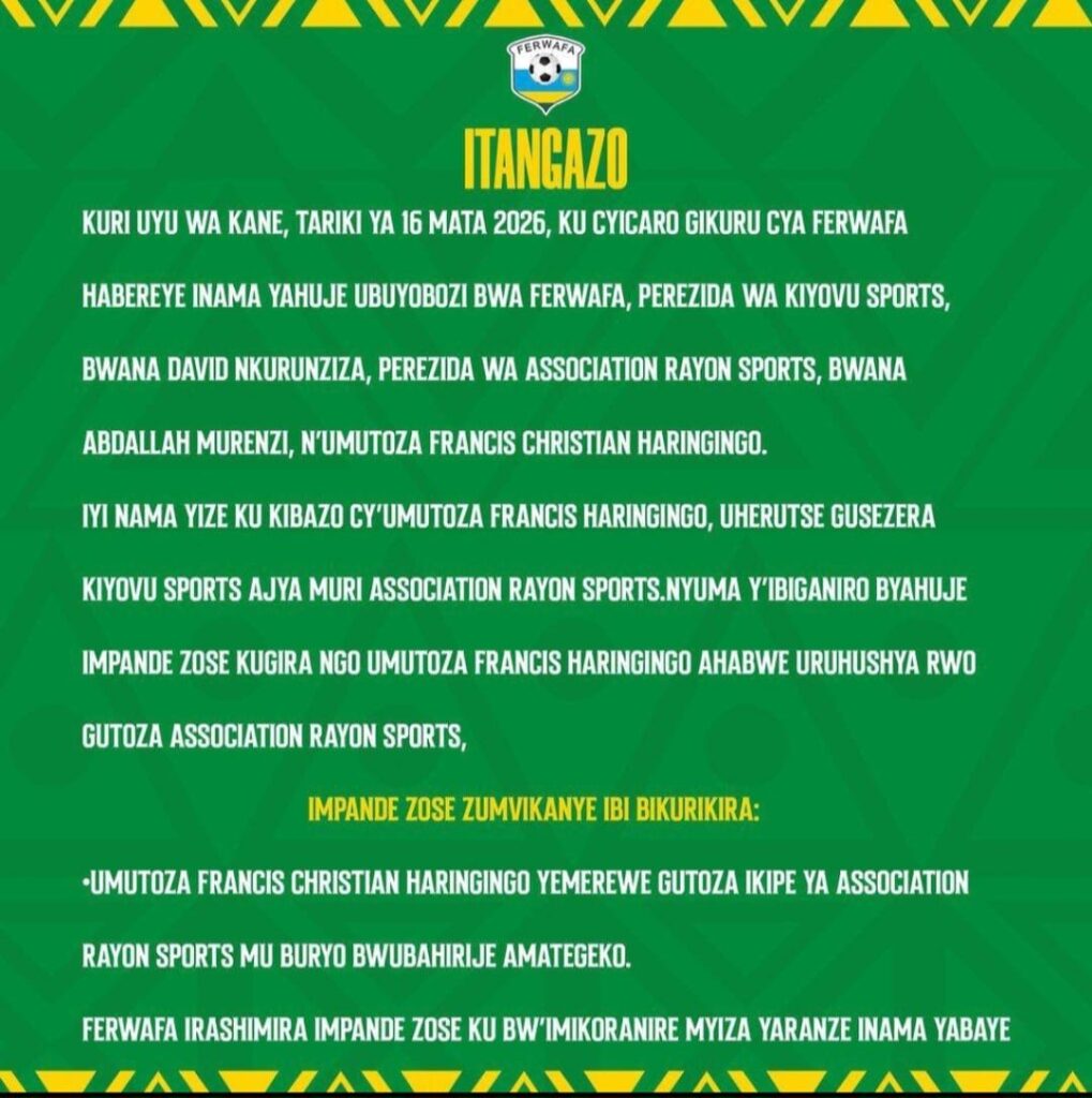 Ni nyuma y’ibiganiro byahurije hamwe Ubuyobozi bwa FERWAFA, Perezida wa Kiyovu Sports, David Nkurunziza, Perezida wa Rayon Sports, Abdallah Murenzi, n’umutoza Francis Christian Haringingo.