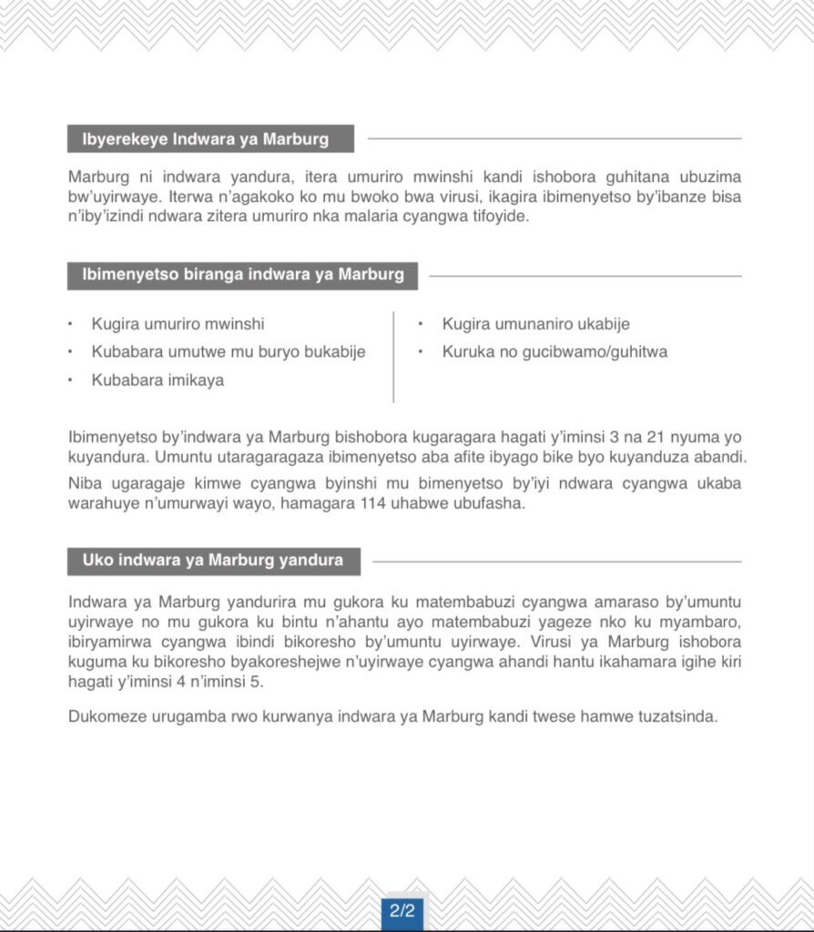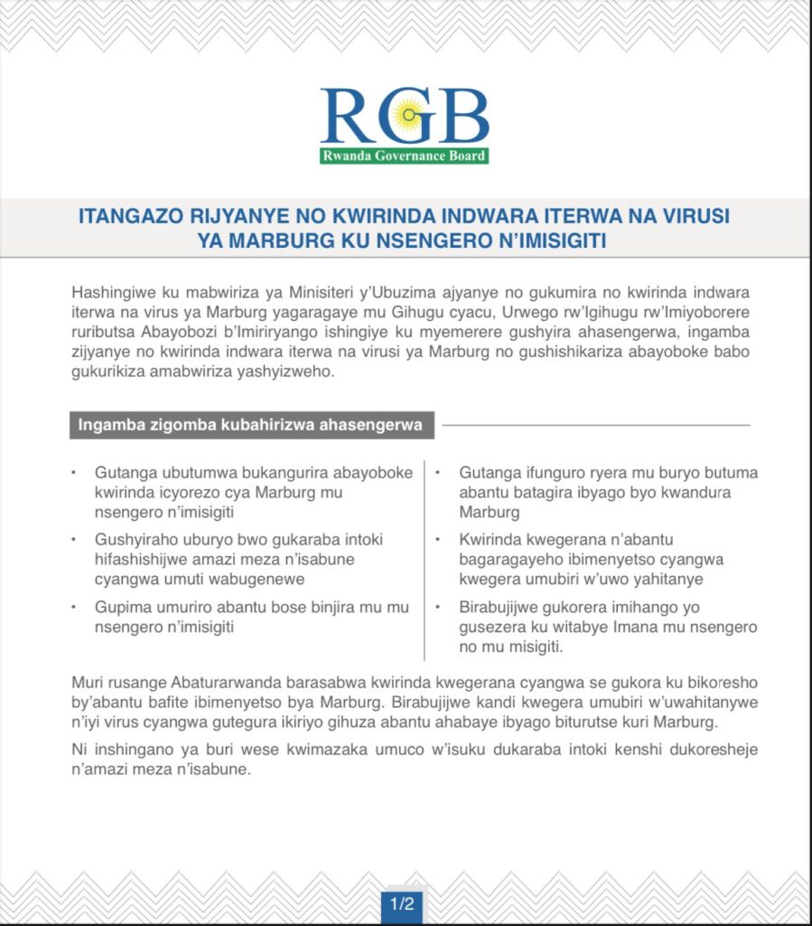 Mu itangazo ryasohotse ku wa 6 Ukwakira 2024, Urwego rw’Igihugu rw’lmiyoborere ruributsa Abayobozi b’Imiryango ishingiye ku myemerere gushyira ahasengerwa ingamba zijyanye no kwirinda indwara iterwa na virusi ya Marburg.