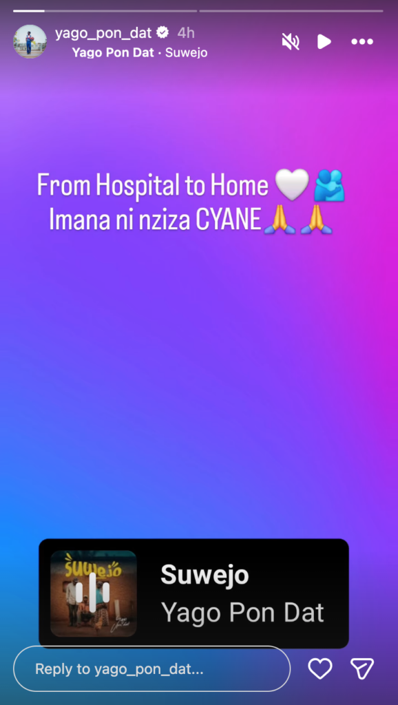 Abinyujije kuri konti ye ya Instagram, ku gicamunsi cyo kuri uyu wa Kane, tariki ya 23 Mata 2026, Yago yagize ati “ Navuye mu bitaro ubu ndi mu rugo, Imana ni nziza cyane”