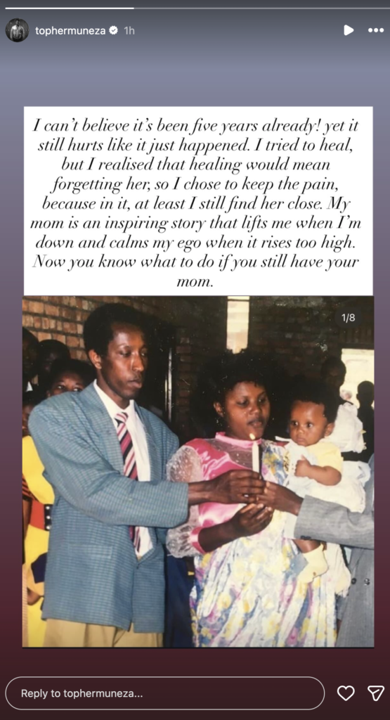 Iyi foto Christopher yayiherekesheje amagambo menshi ari mu rurimi rw’icyongereza aho yavuze ko atabyizera ko imyaka itanu ishize, umubyeyi we yitabye Imana kuko uburibwe bwabyo bukimubabaza nk’ibyabaye vuba.