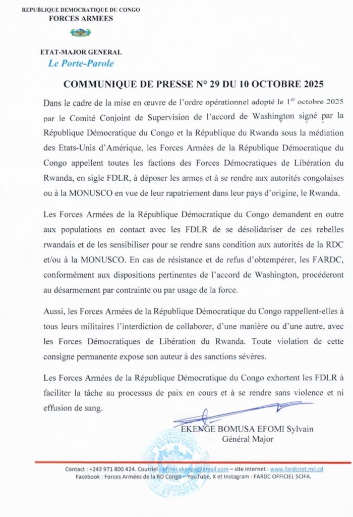 FARDC yasabye ko abasirikare batagomba kugirana imikoranire iyo ari yo yose na FDLR n’indi mitwe mu rwego rwo gushyira mu bikorwa amasezerano ya Washington.