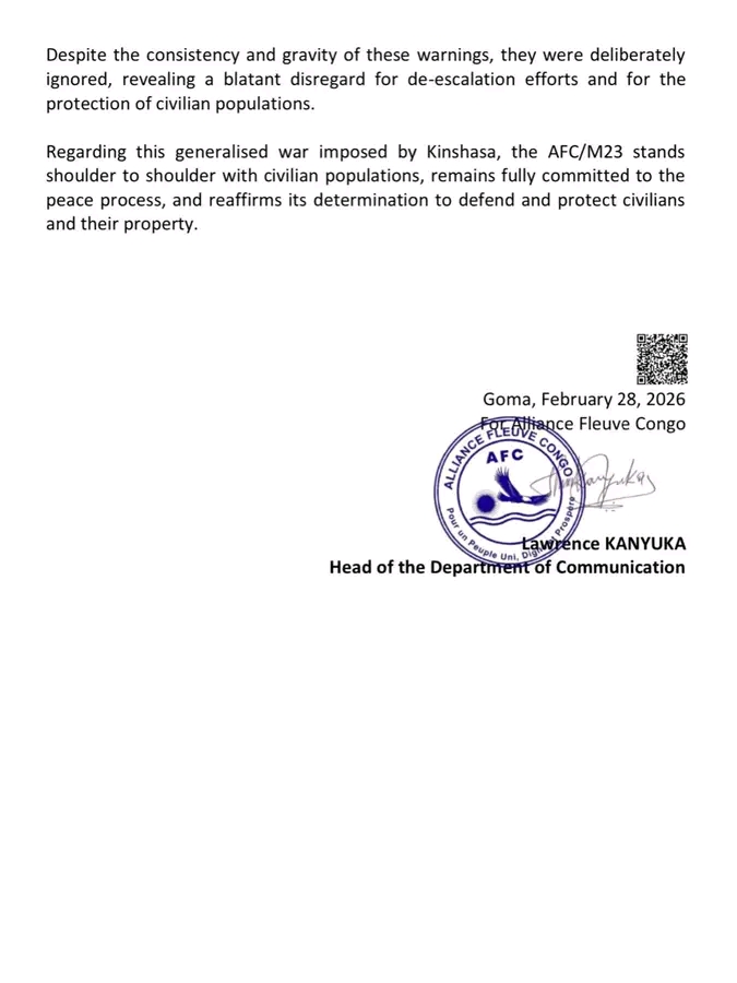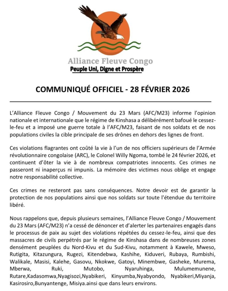 AFC/M23 alleged that drone strikes by government forces have intensified in recent days, claiming they have resulted in civilian casualties as well as the deaths of its combatants, including Ngoma. The group said he was killed on February 24, 2026.