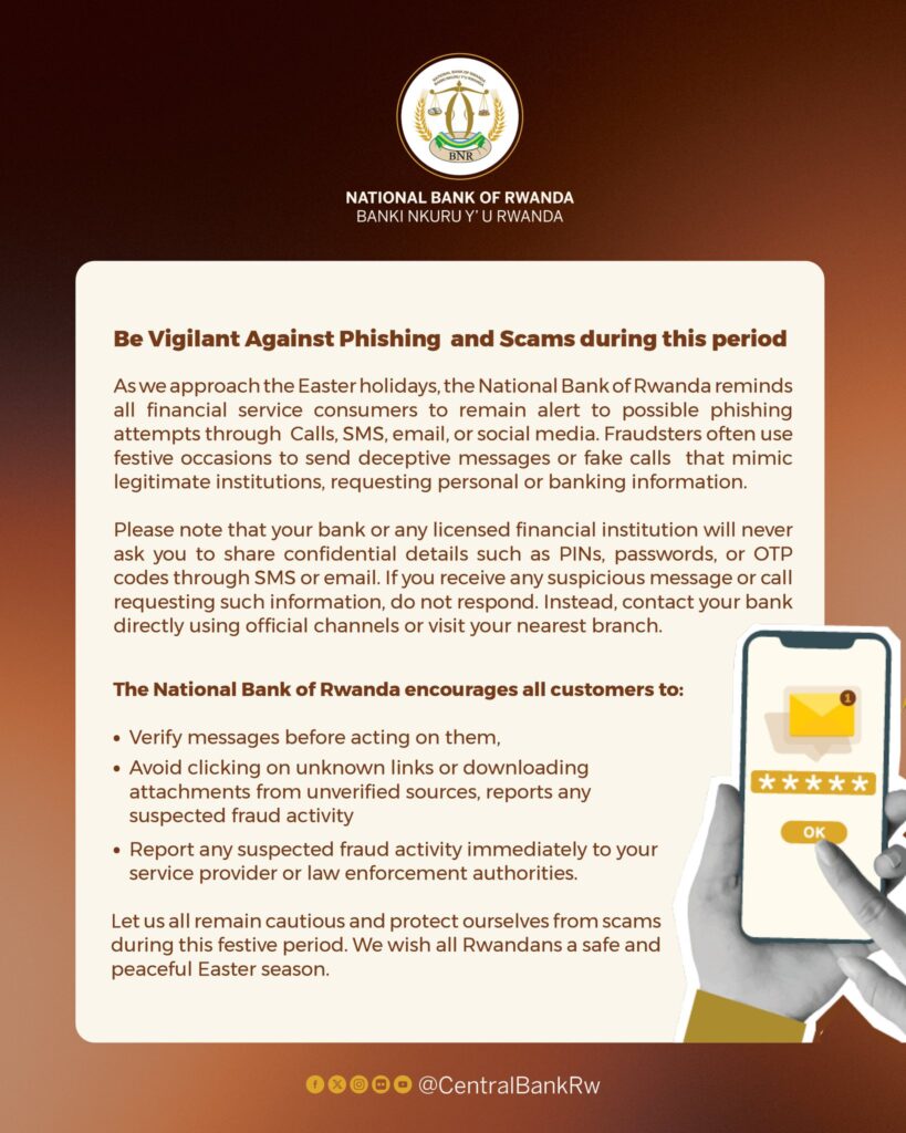 The National Bank of Rwanda (BNR) has urged financial service users to tighten their security and remain vigilant against cybercriminals who may fraudulently access funds from their accounts.