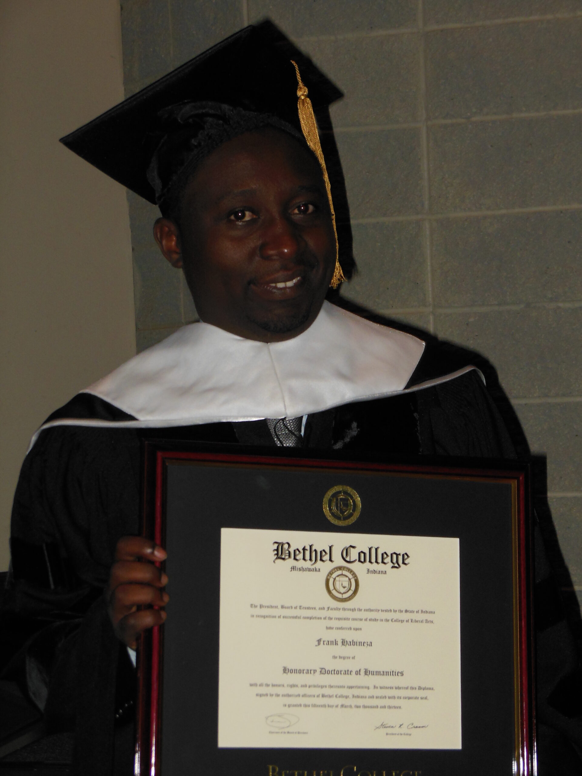 Frank Habineza, President of the Democratic Green Party of Rwanda and a Member of Parliament, received an Honorary Doctorate in Humanities in 2013 from Bethel College/Bethel University in India.