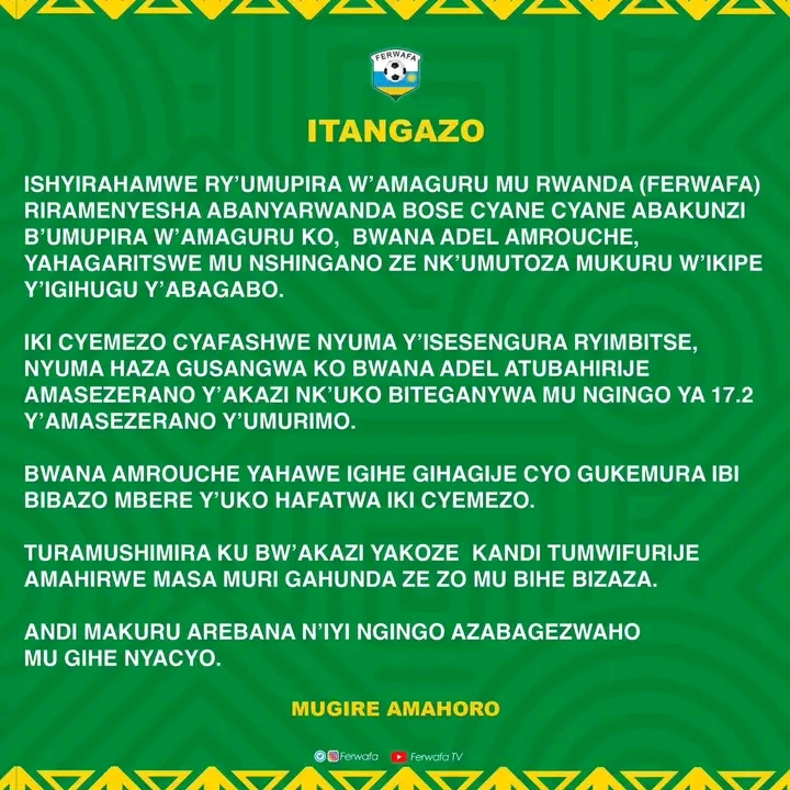 The Rwanda Football Federation (FERWAFA) has dismissed Amavubi head coach Adel Amrouche following a run of poor results.