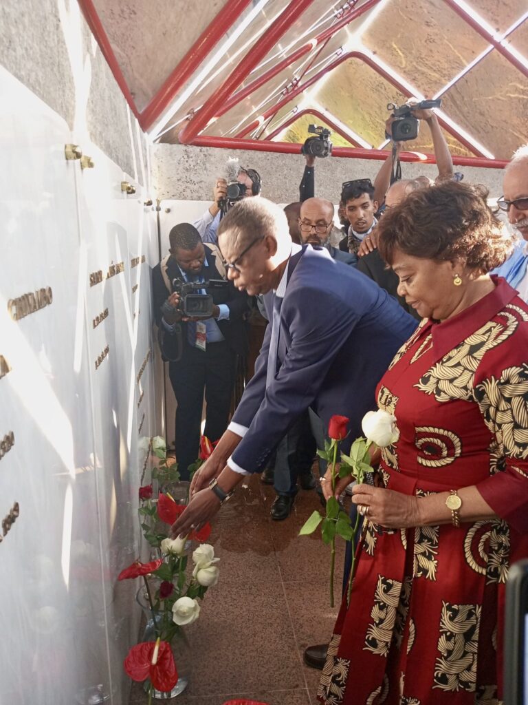 Gen (Rtd) James Kabarebe yifatanyije n’abandi bayobozi mu gikorwa cyo gushyira indabo ku rwibutso rw’Intwari z’igihugu cya Mozambique, kiri ahazwi nka “Heroes’ Square”, mu rwego rwo kuzirikana no guha icyubahiro abayobozi n’abarwanashyaka bagize uruhare mu guharanira ubwigenge bwa Mozambique.