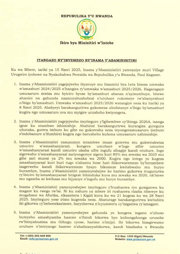 Ku mugoroba wo kuri uyu wa Mbere tariki ya 15 Nzeri 2025, nibwo hateranye Inama y’Abaminisitiri, yiga ku ngingo zitandukanye.
