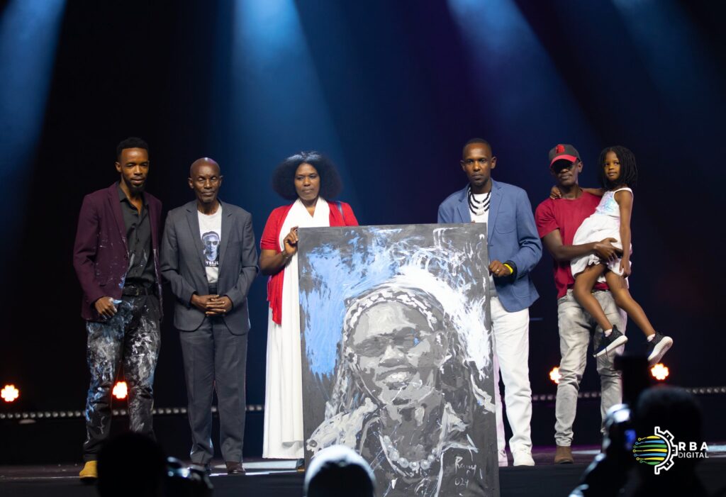 Mu gusoza igitaramo aba bahanzi bose bahuriye ku rubyiniro bari kumwe n’umuryango wa Buravan, bafata ifoto begeranye n’igishushanyo kinini cy’uyu muhanzi.