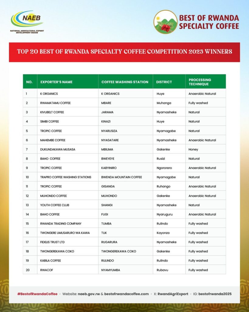 Ikigo cy’Igihugu gishinzwe guteza imbere iyoherezwa mu mahanga ry’Ibikomoka ku Buhinzi n’Ubworozi (NAEB), cyahembye ikawa 20 za mbere nziza zahize izindi mu mwaka wa 2025, binyuze mu irushanwa ngarukamwaka y’ubwiza buhebuje bw’ikawa y’u Rwanda.