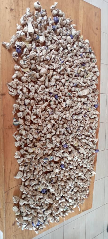 Nyuma yo guhabwa amakuru, abapolisi basatse iwe, bamusangana udupfunyika 750 ku musego w’igitanda n’utundi 50 yari yahishe mu murima w’ibigori uri ku irembo.