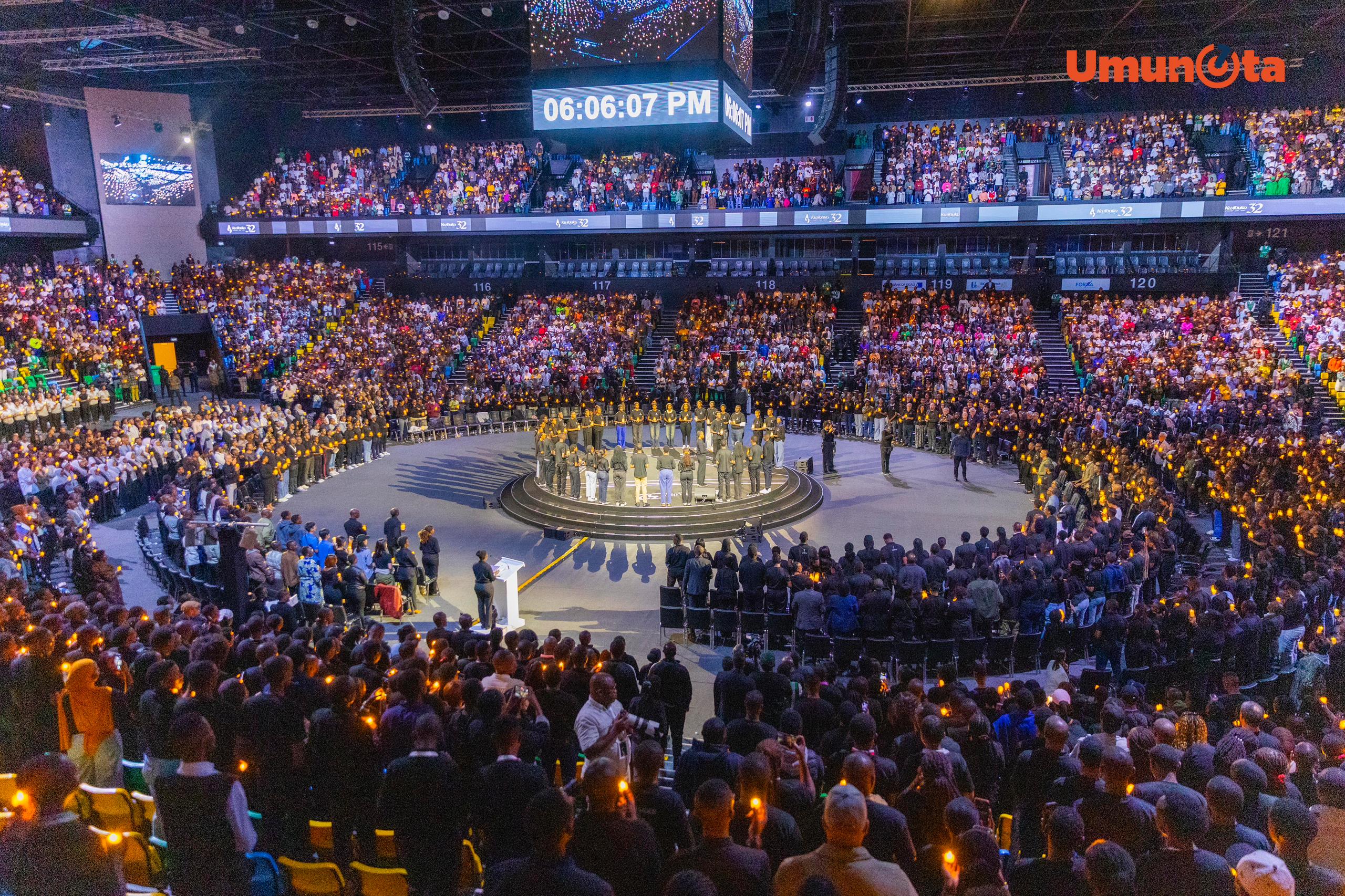 Mu nyubako ya BK Arena, Abanyarwanda batandukanye bateraniye mu gikorwa cy’umugoroba wo #Kwibuka32, Jenoside yakorewe Abatutsi mu 1994.