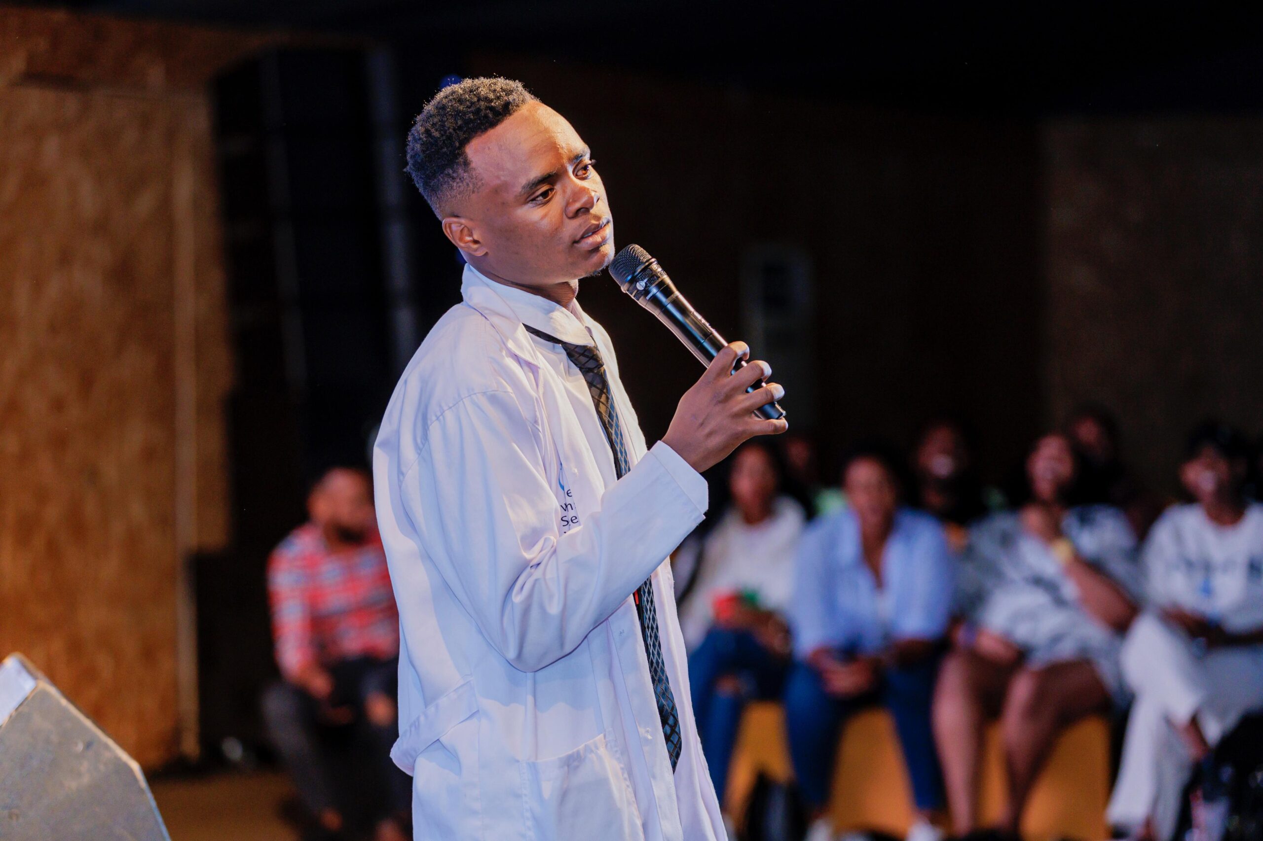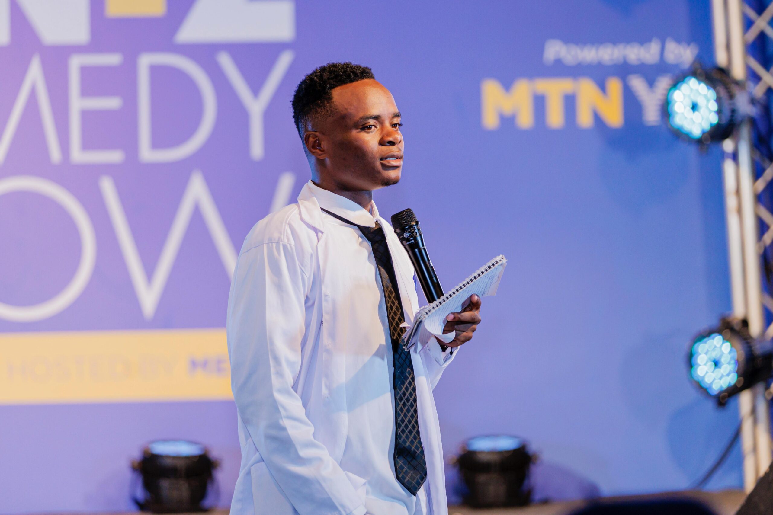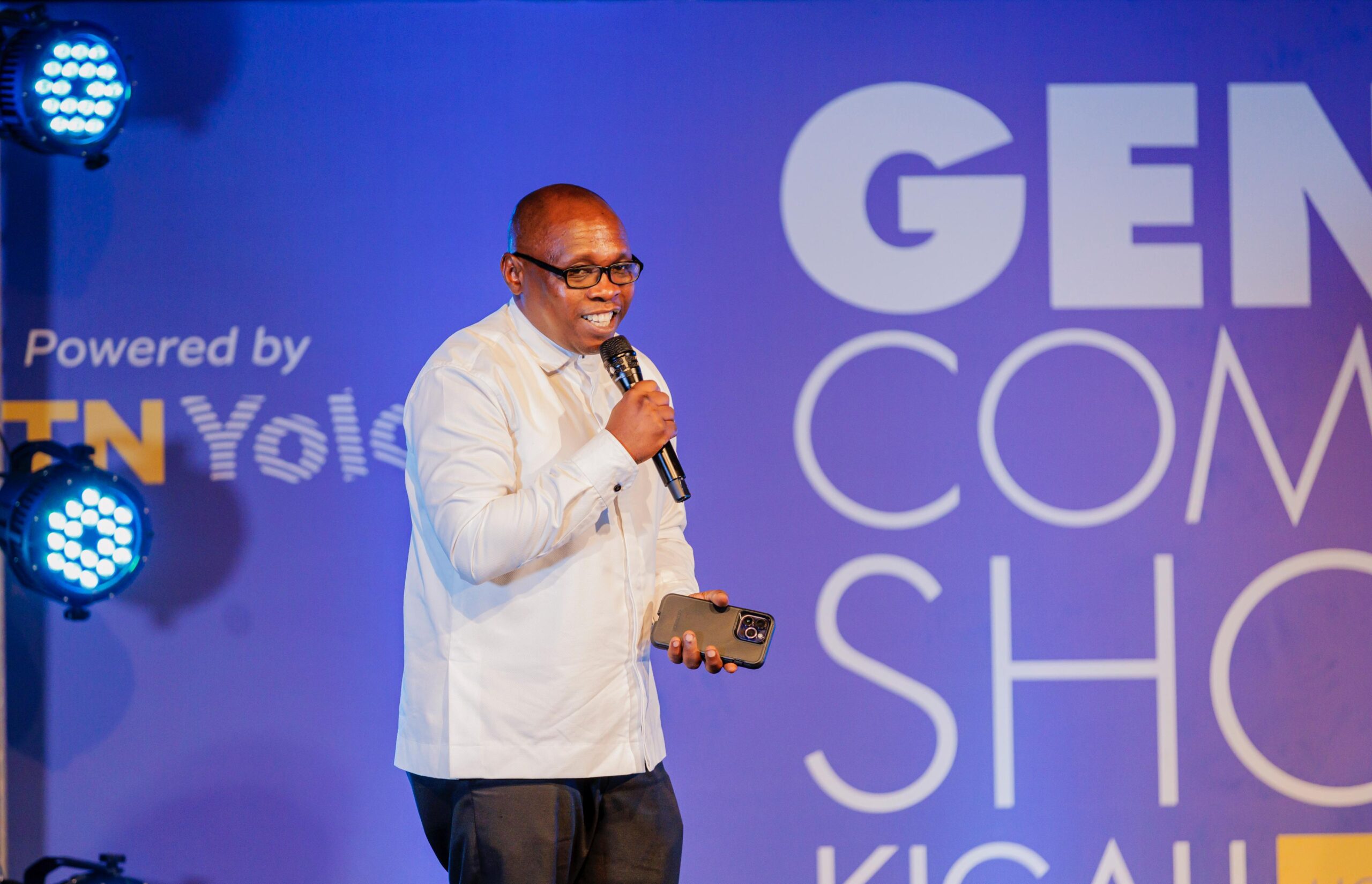 Umunyarwenya Kadudu waserutse mu mwambaro w'umweru hose asekeje abitabiriye Gen-Z Comedy, ndetse atumira ku rubyiniro umuririmbyikazi Divine bafatanya kubyina indirimbo 'Flex' y'umuhanzi wo muri Nigeria, Kizz Daniel.