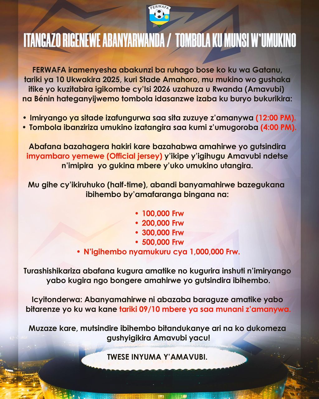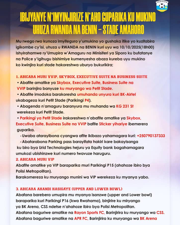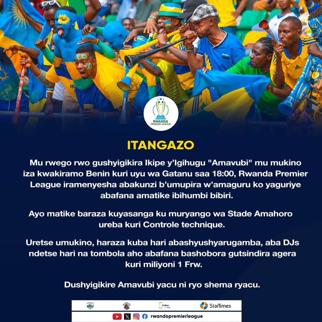 Muri iyi mikino ibiri, Ikipe y’Igihugu y’u Rwanda izakina na Benin mu mukino uzabera kuri Stade Amahoro, ku wa Gatanu tariki ya 10 Ukwakira 2025, yongere guhura na Afurika y’Epfo ku wa Kabiri w’Icyumweru gitaha, tariki ya 14 Ukwakira 2025.