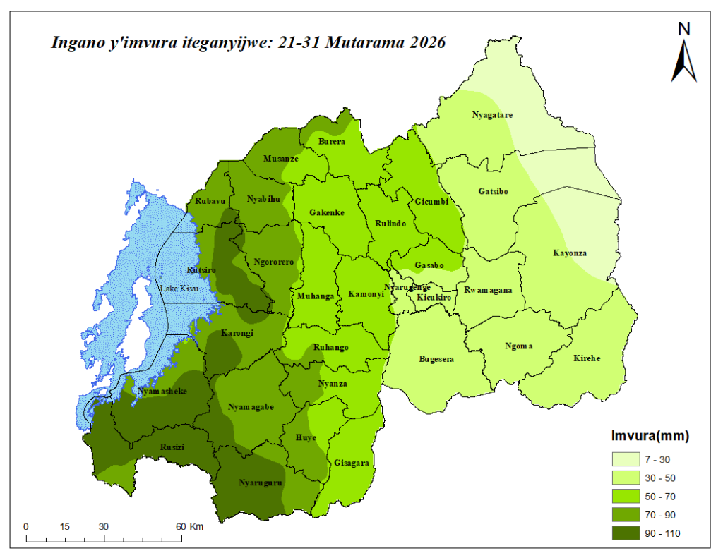 Nk’uko bigaragazwa mu iteganyagihe ryo kuva tariki ya 21 kugeza tariki ya 31 Mutarama 2026, imvura iteganyijwe izaba iri hagati ya milimetero 7 na 110, ikagwa mu minsi iri hagati y’umunsi umwe n’itatu bitewe n’ahantu.