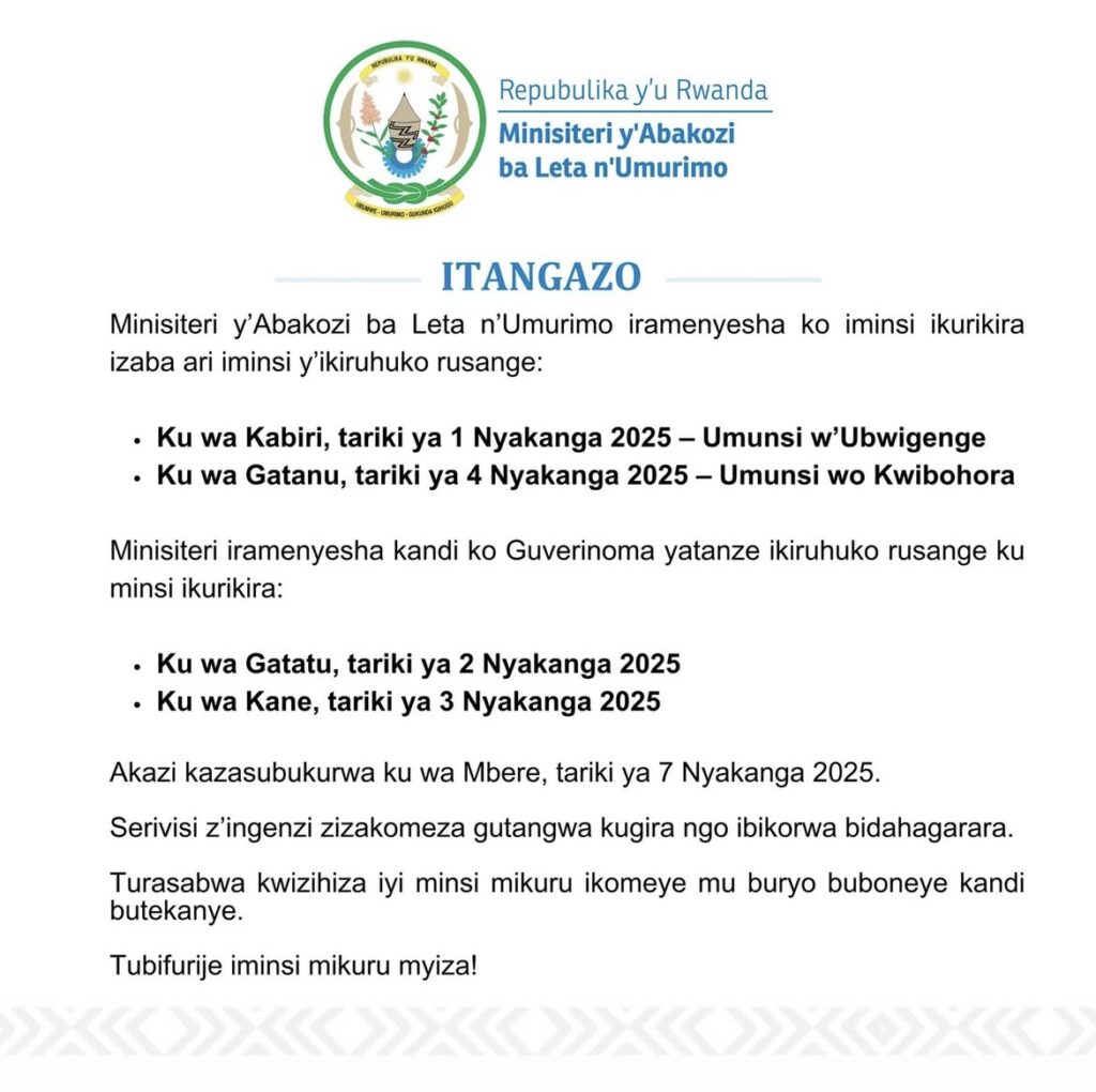 Minisiteri y’Abakozi ba Leta n’Umurimo yatangaje ko kuva ku wa Kabiri, tariki ya 1 Nyakanga kugeza ku wa Gatanu, tariki ya 4 Nyakanga 2025, ndetse n’indi minsi ibiri iri hagati, ari iminsi y’ikiruhuko rusange mu gihugu hose.