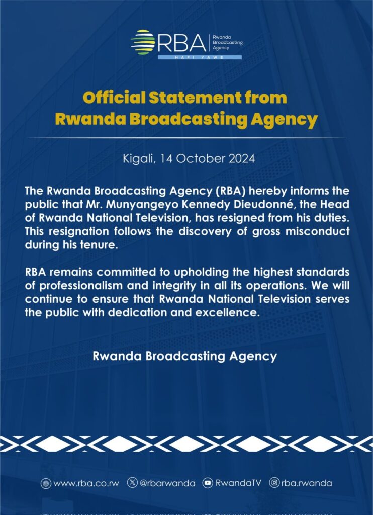 Ikigo cy’Igihugu cy’Itangazamakuru (RBA) cyatangaje ko Munyangeyo Kennedy Dieudonné, wari Umuyobozi wa Televiziyo Rwanda, yeguye ku mirimo ye.