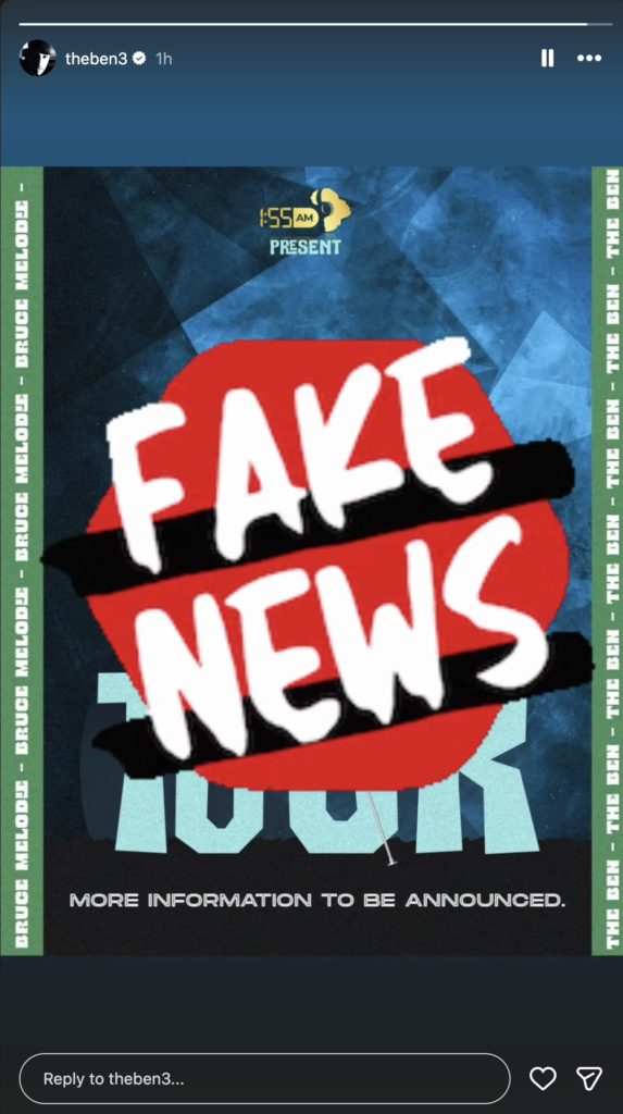 Nyuma y’amasaha macye Bruce Melodie atangaje ibi, The Ben yifashishije urubuga rwe rwa Instagram yagiye ahashyirwa ubutumwa bw’amasaaha 24, “Stories” maze atangaza ko ayo makuru ari ‘Ibihuha’.