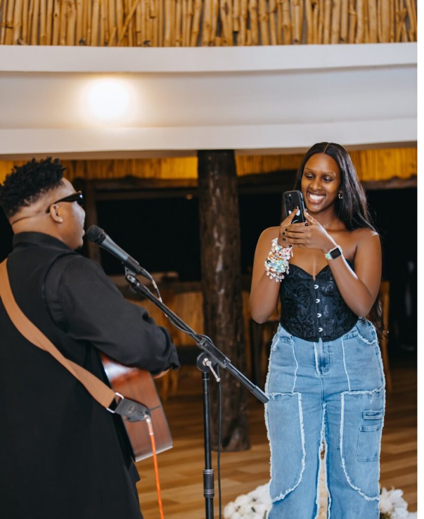 Niyo Bosco nawe wari umaze kumva ko umukunzi we ahageze, , yahise atangura kumucurangira indirimbo y’urukundo akoreseheje gitari, hanyuma amufata ikiganza amubaza niba koko yakwemera ko barushinga.
