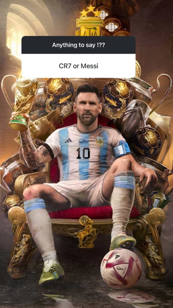 Asubiza iki kibazo Bwiza yahise akoresha ifoto ya Lionel  Messi, yicaye mu ntebe nk’umwami ateruye igikombe cy’Isi aseguwe ibihembo bya Ballondor 8 yatwaye.
