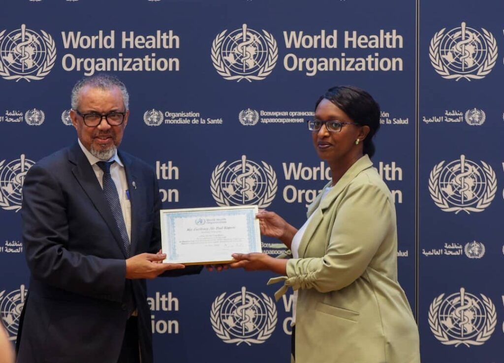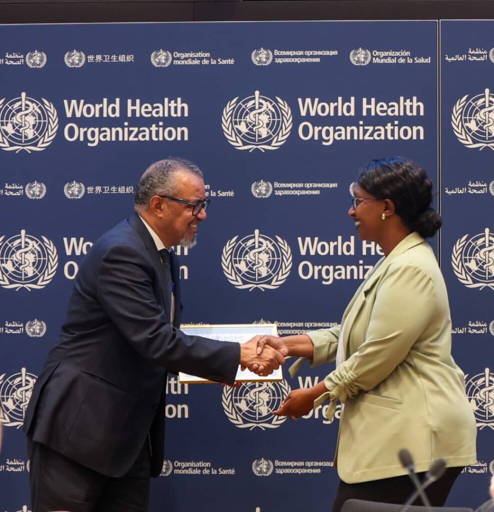 Icyemezo cy’ishimwe cya Perezida Kagame cyatanzwe n’Umuyobozi Mukuru wa OMS, Dr Tedros Adhanom Ghebreyesus, cyakirwa na Ambasaderi Urujeni Bakuramutsa uhagarariye u Rwanda muri Loni no mu yindi miryango mpuzamahanga iherereye i Genève mu Busuwisi.