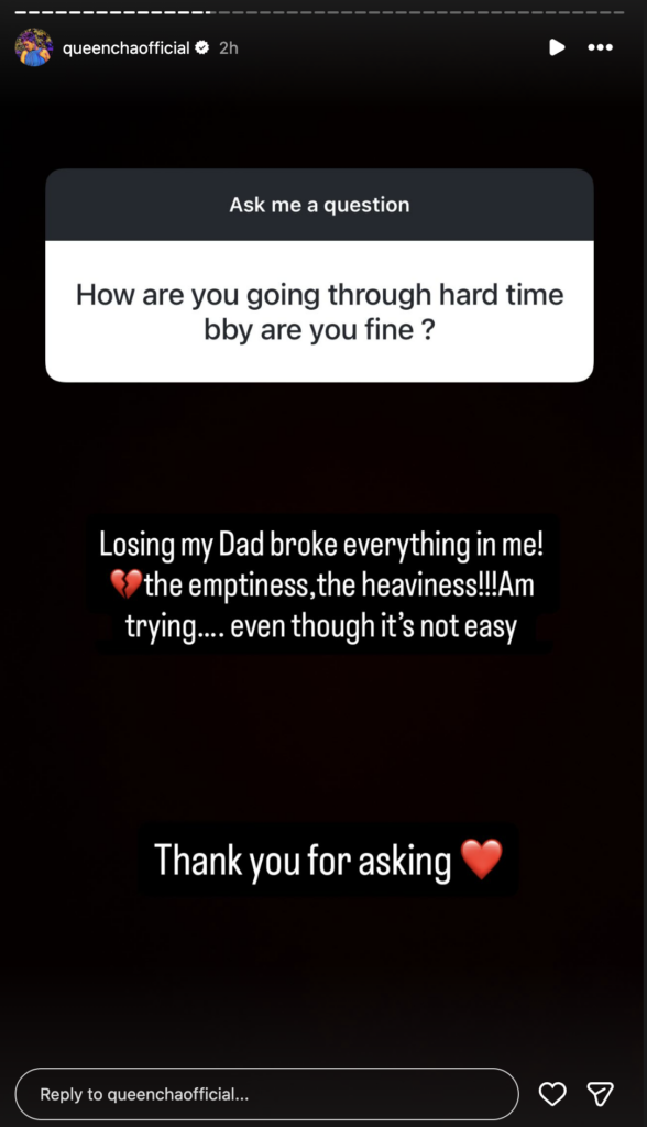 Mu gusubiza Queen Cha yavuze ko urupfu rwa Se, Dr Mugemana rwamushegeshe bikomeye gusa kuri ubu arimo kugerageza kubyakira.