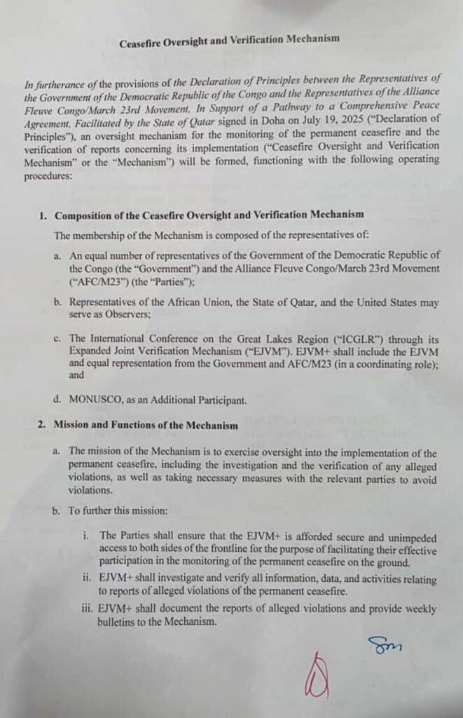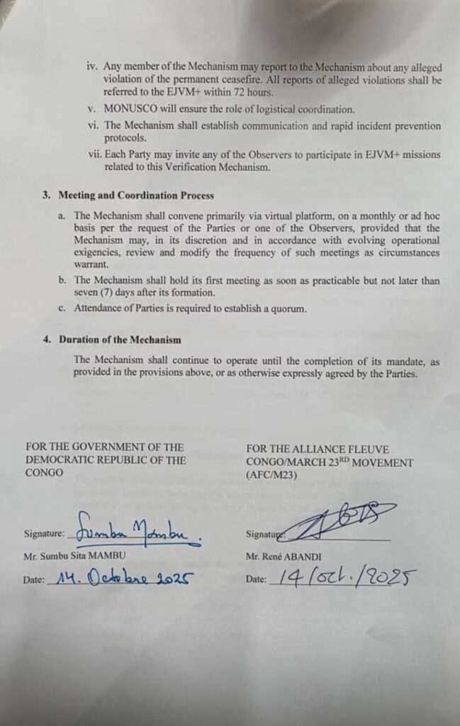 Repubulika Iharanira Demokarasi ya Congo n’Ihuriro rya AFC/M23, bashyize umukono ku masezerano yerekeranye n’ishyirwa mu bikorwa ryo guhagarika imirwano.