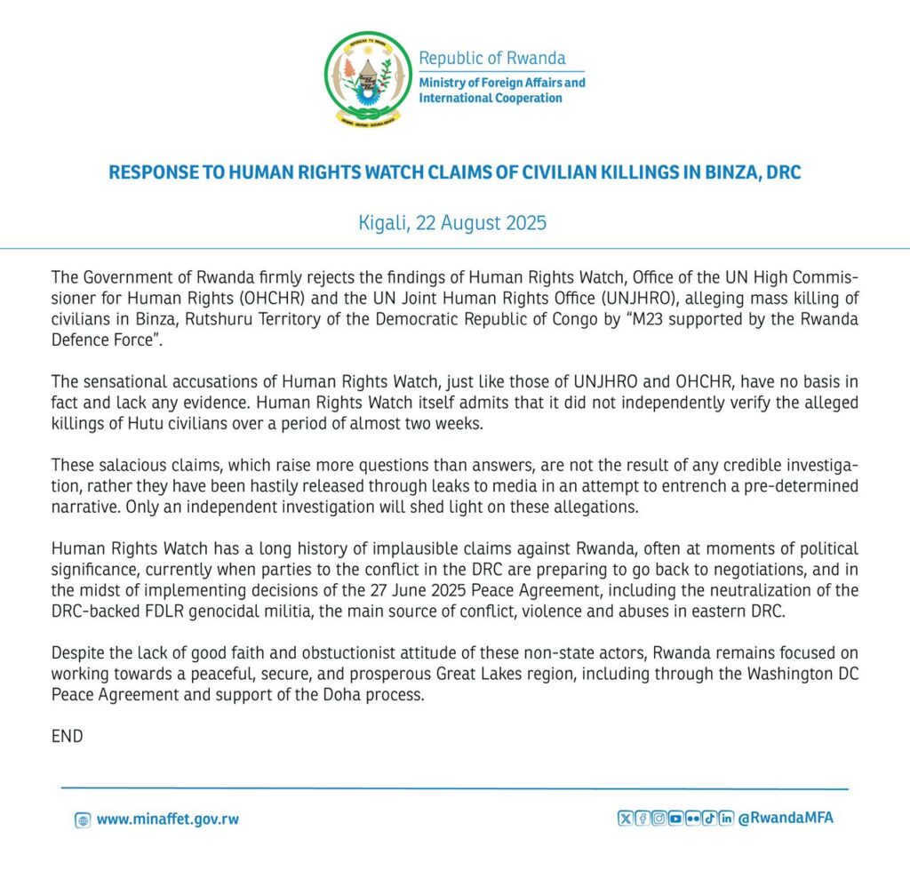 Guverinoma y’u Rwanda yamaganye raporo yatangajwe na Human Rights Watch, Ibiro bya Loni bishinzwe Uburenganzira bwa Muntu (OHCHR) n’Ibiro bihuriweho bya Loni bishinzwe Uburenganzira bwa Muntu (UNJHRO), ishinja ingabo z’u Rwanda, RDF, gufasha M23 mu bwicanyi bwakorewe abasivile muri Binza muri teritware ya Rutshuru mu Burasirazuba bwa Repubulika Iharanira Demokarasi ya Congo.