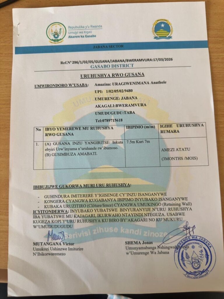 Emma Claudine avuga ko uyu wasenyewe yari yatse icyangombwa cyo gusana inzu ifite metero 7,5X7, maze aragihabwa.