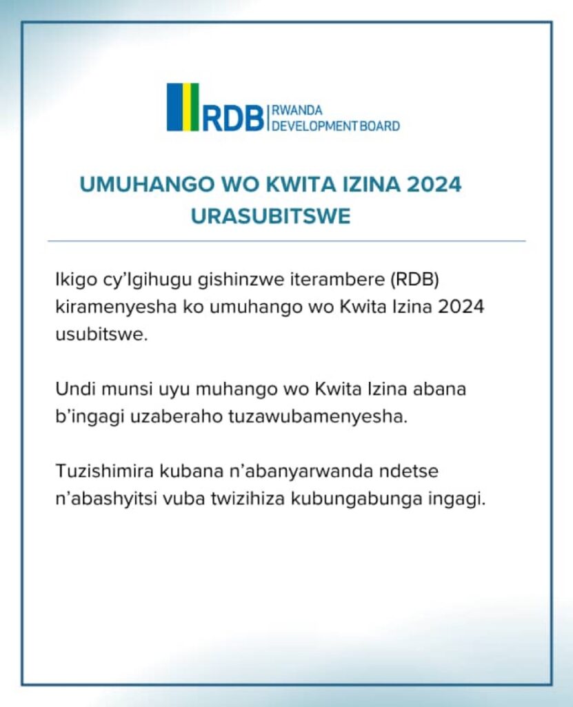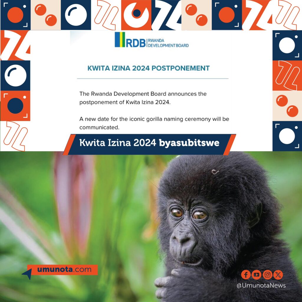 Iri tangazo rigira riti “Ikigo cy’lgihugu gishinzwe iterambere (RDB) kiramenyesha ko umuhango wo Kwita Izina 2024 usubitswe. Undi munsi uyu muhango wo Kwita Izina abana b’ingagi uzaberaho tuzawubamenyesha.”