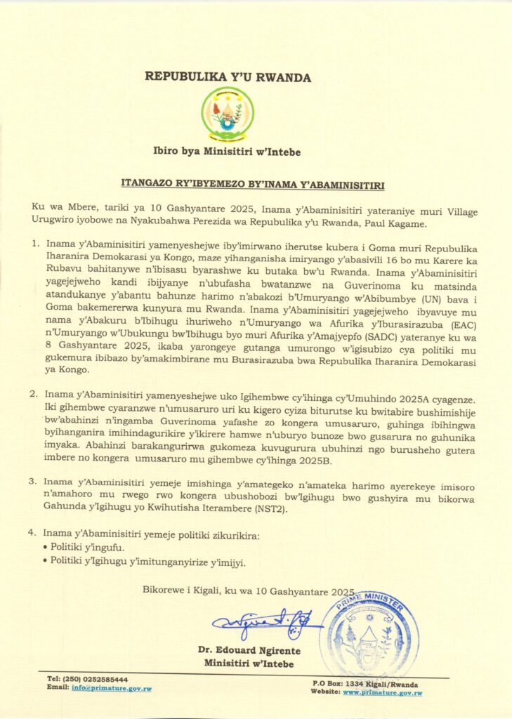 Kuri uyu wa mbere, tariki ya 10 Gashyantare 2025, Inama y’Abaminisitiri yateranye iyobowe na Perezida wa Repubulika y’u Rwanda, Paul Kagame, yagarutse ku mutekano muke umaze iminsi mu mujyi wa Goma, mu Burasirazuba bwa Repubulika Iharanira Demokarasi ya Congo.