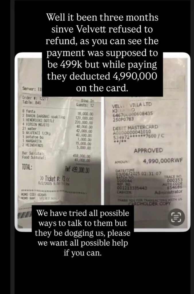 Uyu asobanura ko tariki ya 3 Kamena 2025, yagiye muri iyi Bar na Resto, akaka serivisi , agiye kwishyura , yishyura akoresheje Visa Card, akishyura Miliyoni 4 n’ibihumbi magana icyenda na mirongo icyenda (, 4,990,000 RWF) kandi yaragombaga kwishyura ibihumbi 499 Frw  nkuko n’inyemezabwishyu zibigaragaza.