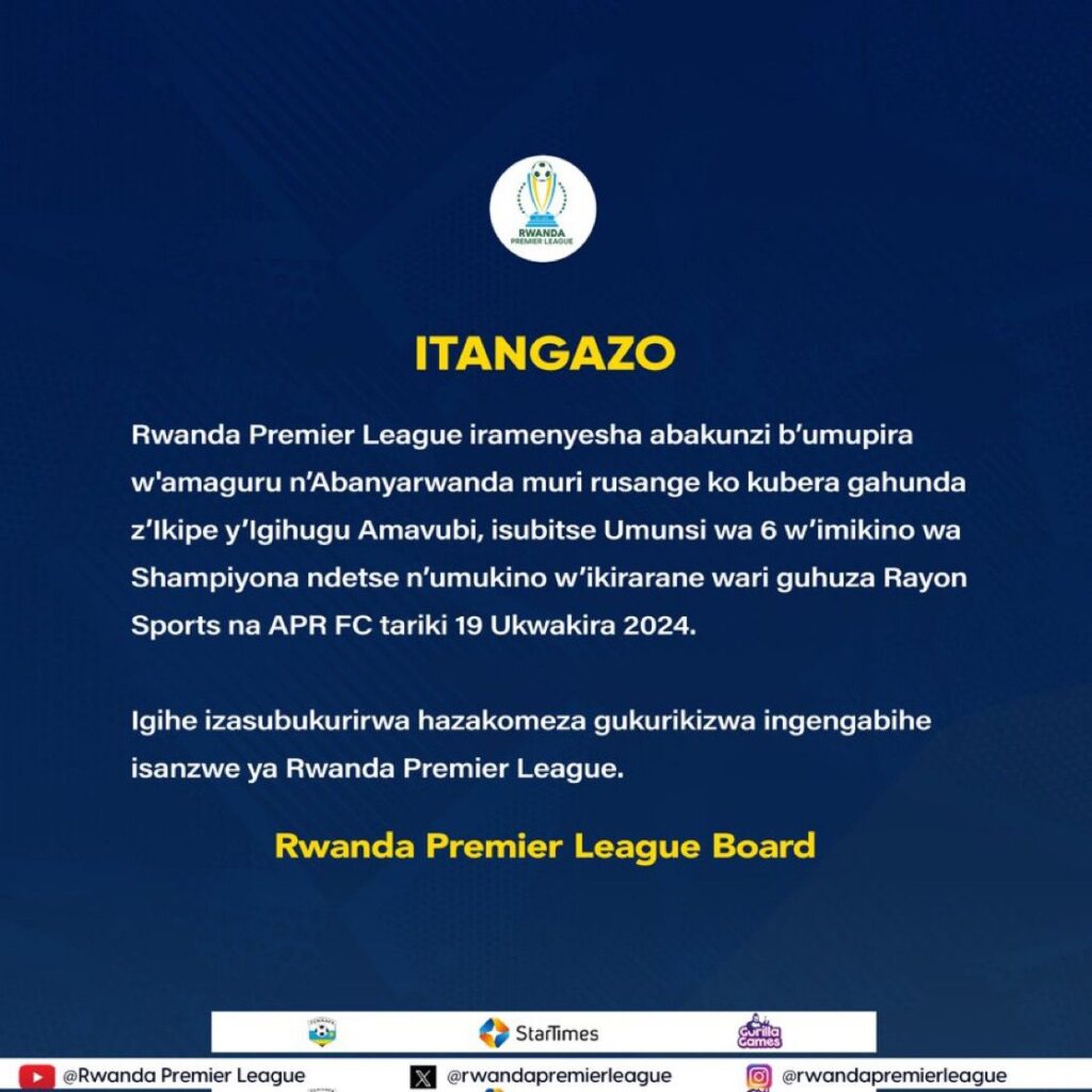 Riragira riti” Rwanda Premier League iramenyesha abakunzi b’umupira w’amaguru n’Abanyarwanda muri rusange ko kubera gahunda z’Ikipe y’igihugu y’Amavubi, isubitse Umunsi wa 6 w’imikino wa Shampiyona ndetse n’umukino w’ikirarane wari guhuza Rayon Sports na APR FC, tariki 19 Ukwakira 2024.”